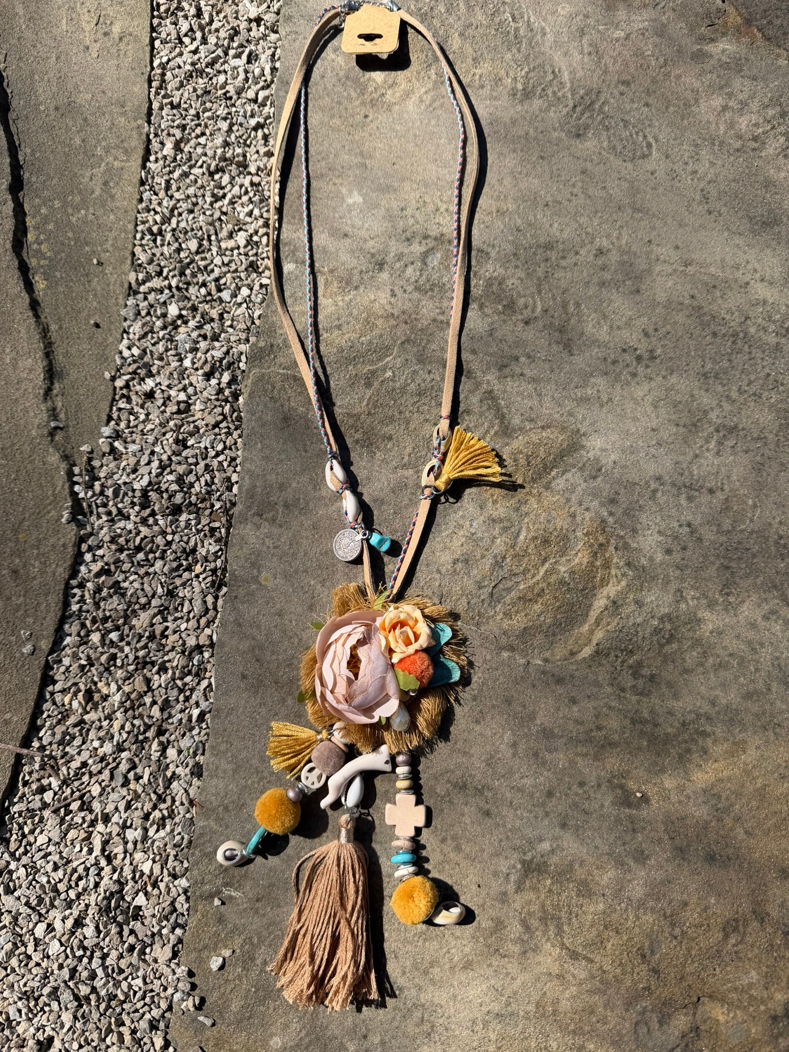 Festival inspired summer vibe statement necklace featuring a multi strand strand with a golden 3D flower design, charms, and shells. Pair with one of our lux bohemian dresses for the perfect festival look.