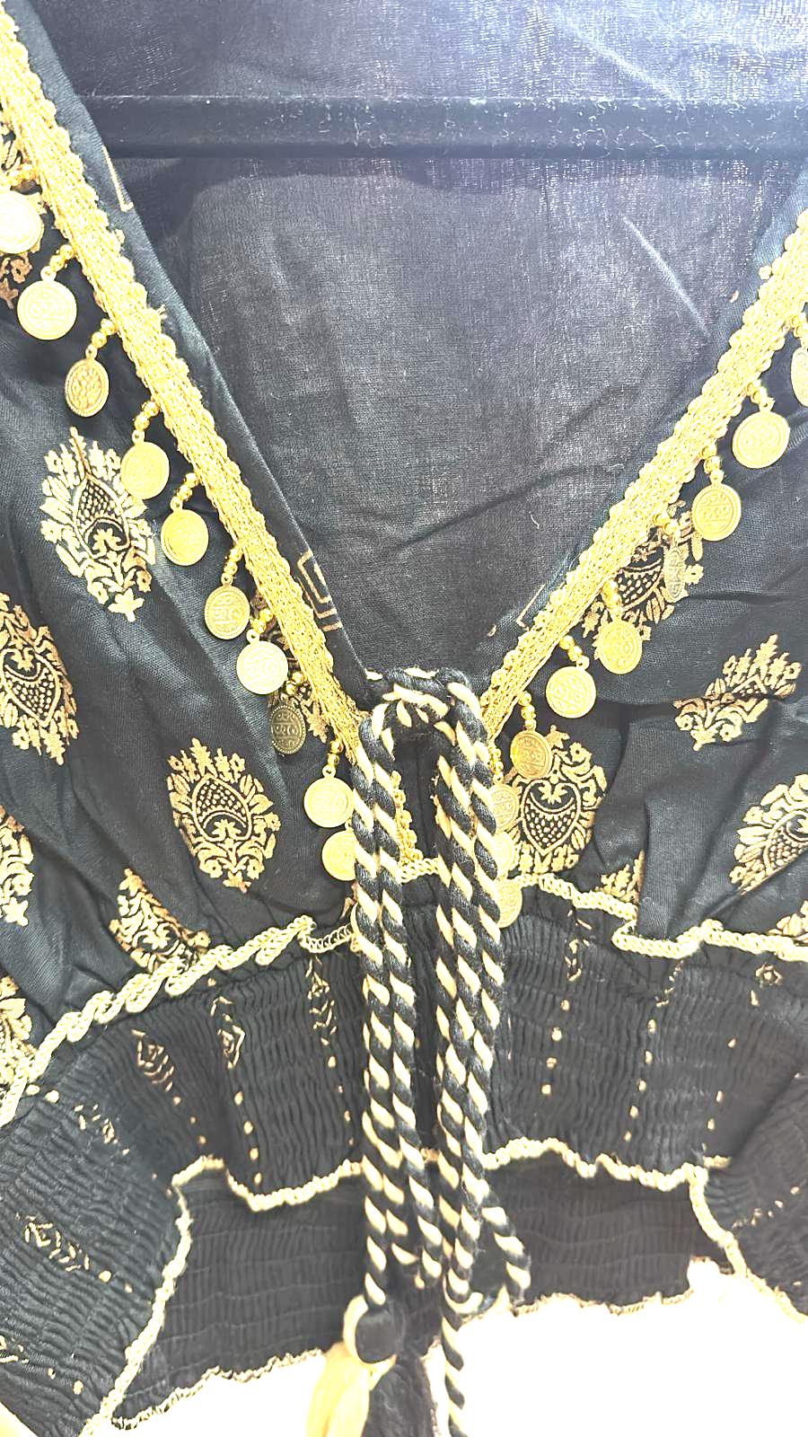 This beautiful bohemian gypsy cotton ruffled skirt and matching flirty top is the perfect summer outfit. Its versatile style makes it perfect for those festival nights or sandy beaches. The definition of ethereal, this statement skirt set has all of our favorite details: lux sequin details, beautiful gypsy print, delicate tassel ties, and a flattering v neck in front and back for an eye-catching finish.