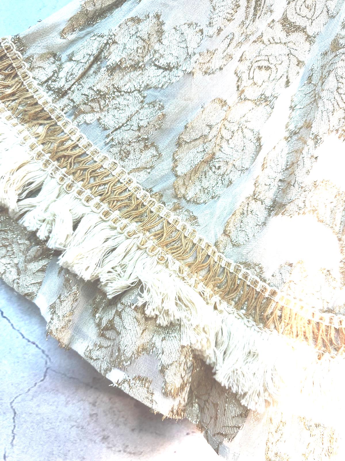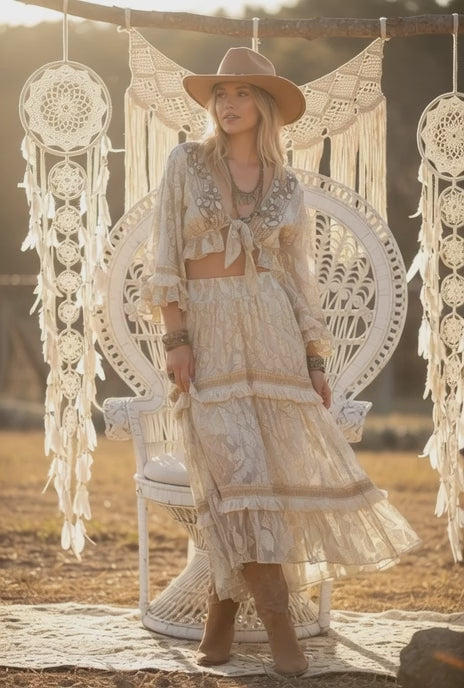 This beautiful bohemian western cotton ruffled skirt and matching flirty top is the perfect summer outfit. Its versatile style makes it perfect for those rodeo nights or sandy beaches. The definition of ethereal, this statement skirt set has all of our favorite details: lux beaded and macrame details, beautiful lurex fabric, and a flattering v neck in front and back for an eye-catching finish.