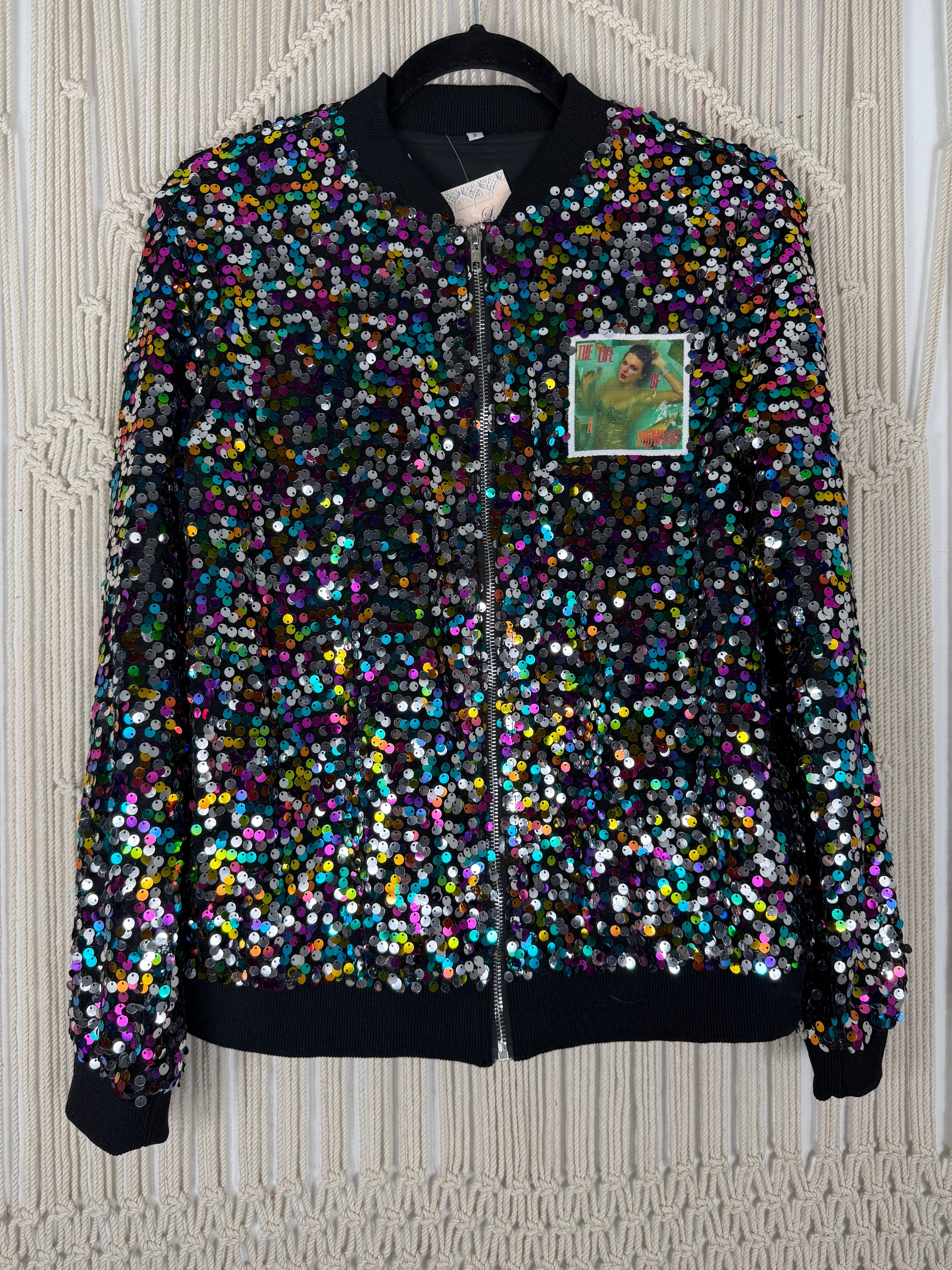 This Showgirl inspired jacket is featured in an oversized silhouette featuring a Showgirl graphic from T.S.'s album and beautiful lux velvet sequin sleeve and pocket details.
