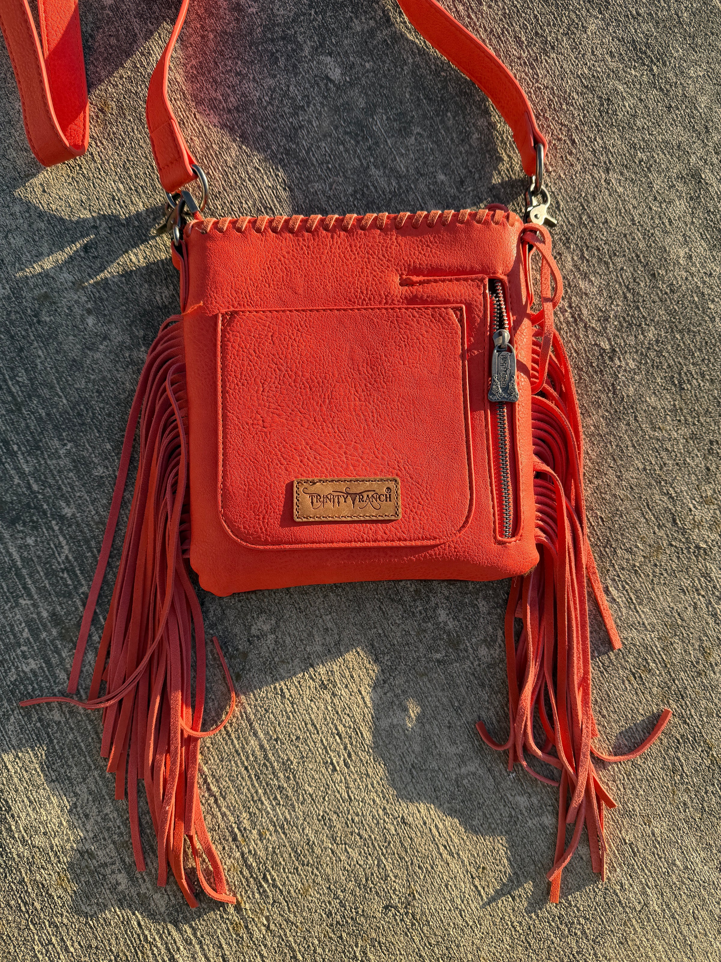 Cierra Lauren is proud to present the fabulous Trinity Ranch Hair On Cowhide Orange Fringed Concealed Carry Crossbody Bag! The Cowhide upper is natural and will wear under normal conditions.